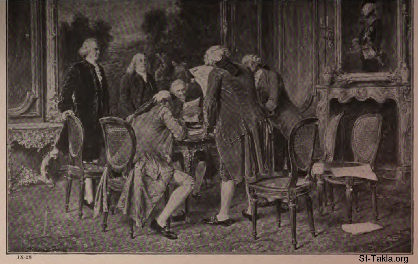 Our First Friendly Treaty (Franklin and Jefferson Signing the "Treaty of The Hague"), from a painting by the German artist, G. Suter. - from the book: The Story of the Greatest Nations 9, by Edward S. Ellis and Francis Horne, 1901-1914.