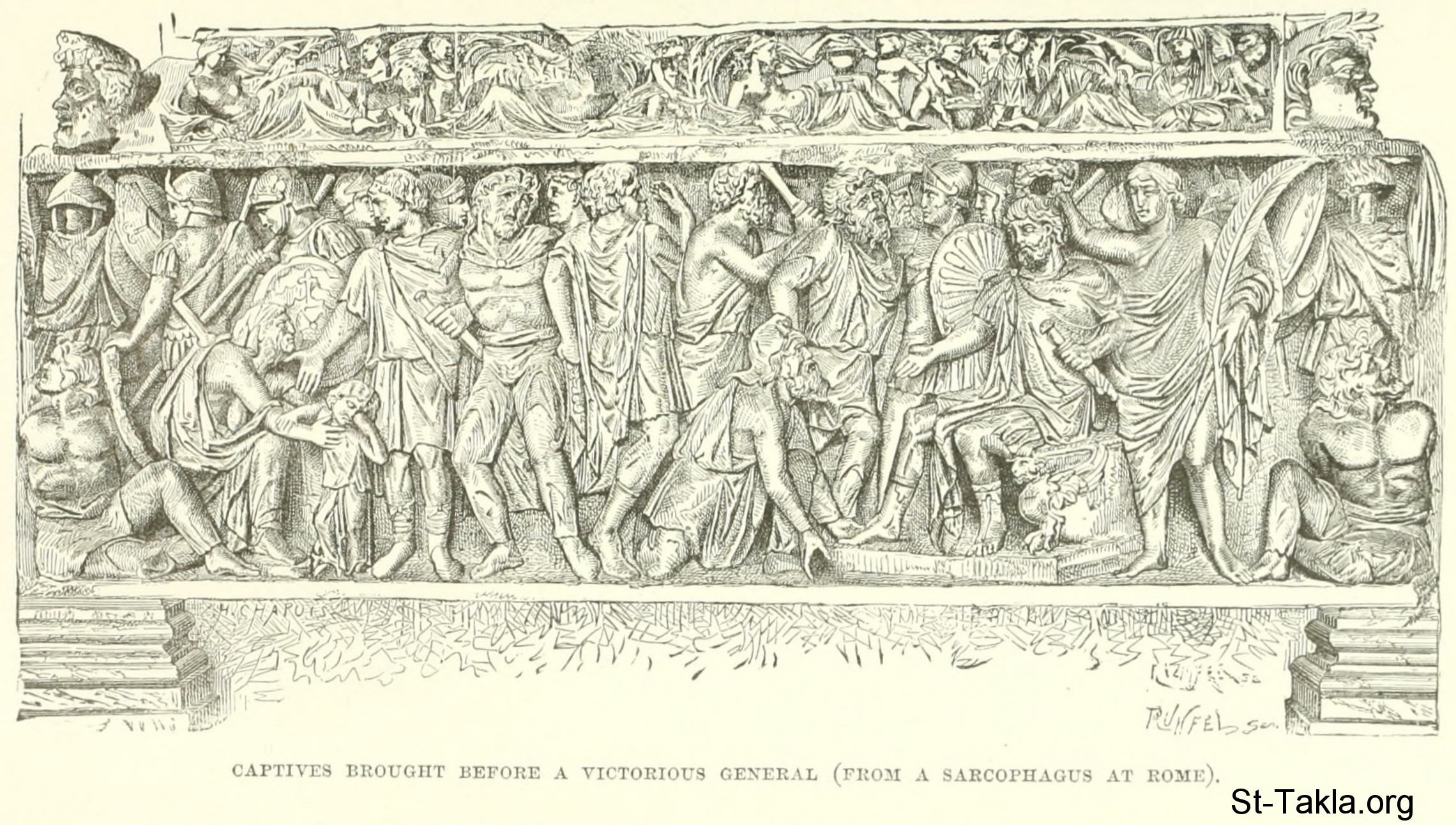 Captives brought before a victorious general (from a sarcophagus at Rome) - History of Rome, and of the Roman people, from its origin to the invasion of the barbarians (Volume 6), book by Jean Victor Duruy, 1884.