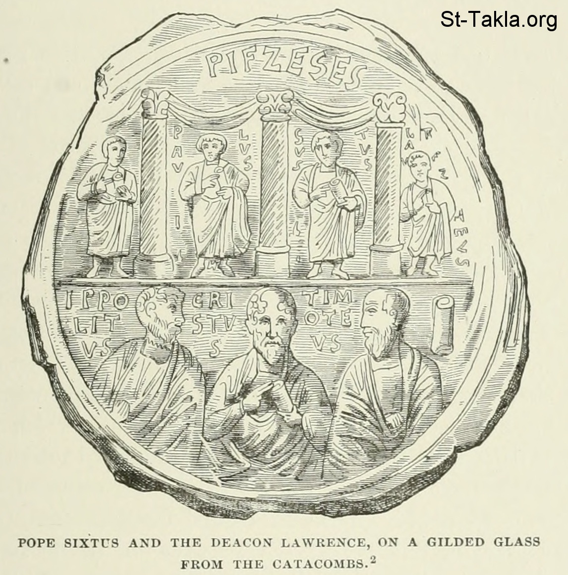 Pope Sixtus and the Deacon Lawrence, on a guilded glass from the catacombs - History of Rome, and of the Roman people, from its origin to the invasion of the barbarians (Volume 7), book by Jean Victor Duruy, 1884.