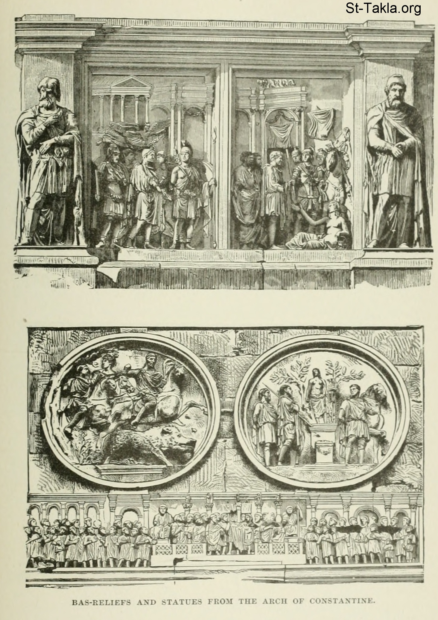 Bas-relief and statues from the arch of Constantine - History of Rome, and of the Roman people, from its origin to the invasion of the barbarians (Volume 7), book by Jean Victor Duruy, 1884.