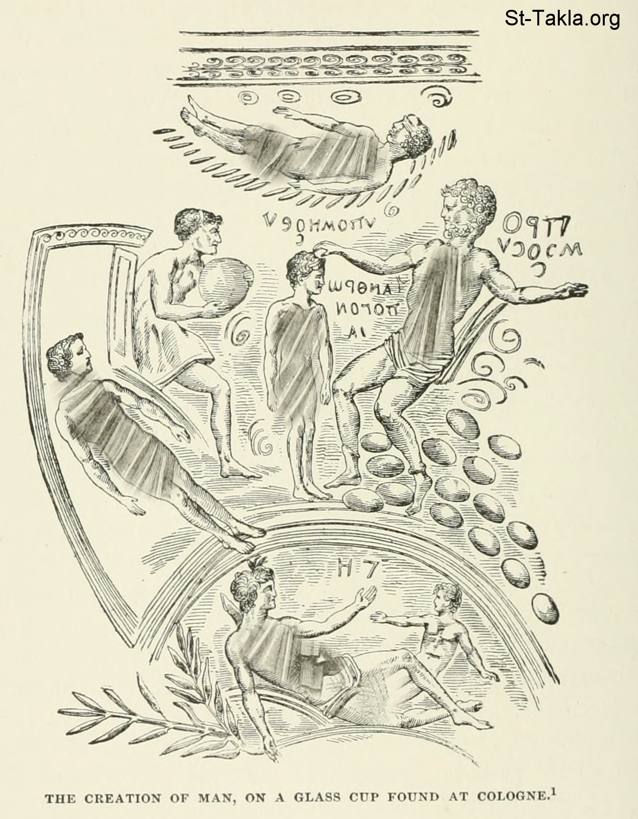 The creation of man, on a glass cup found at Cologne - History of Rome, and of the Roman people, from its origin to the invasion of the barbarians (Volume 8), book by Jean Victor Duruy, 1884.