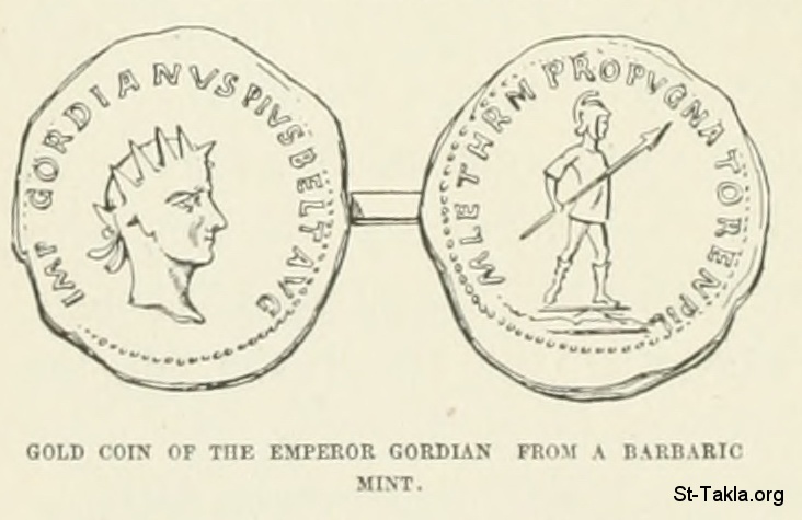 Gold coin of the Emperor Gordian from the barbaric mint - History of Rome, and of the Roman people, from its origin to the invasion of the barbarians (Volume 8), book by Jean Victor Duruy, 1884.