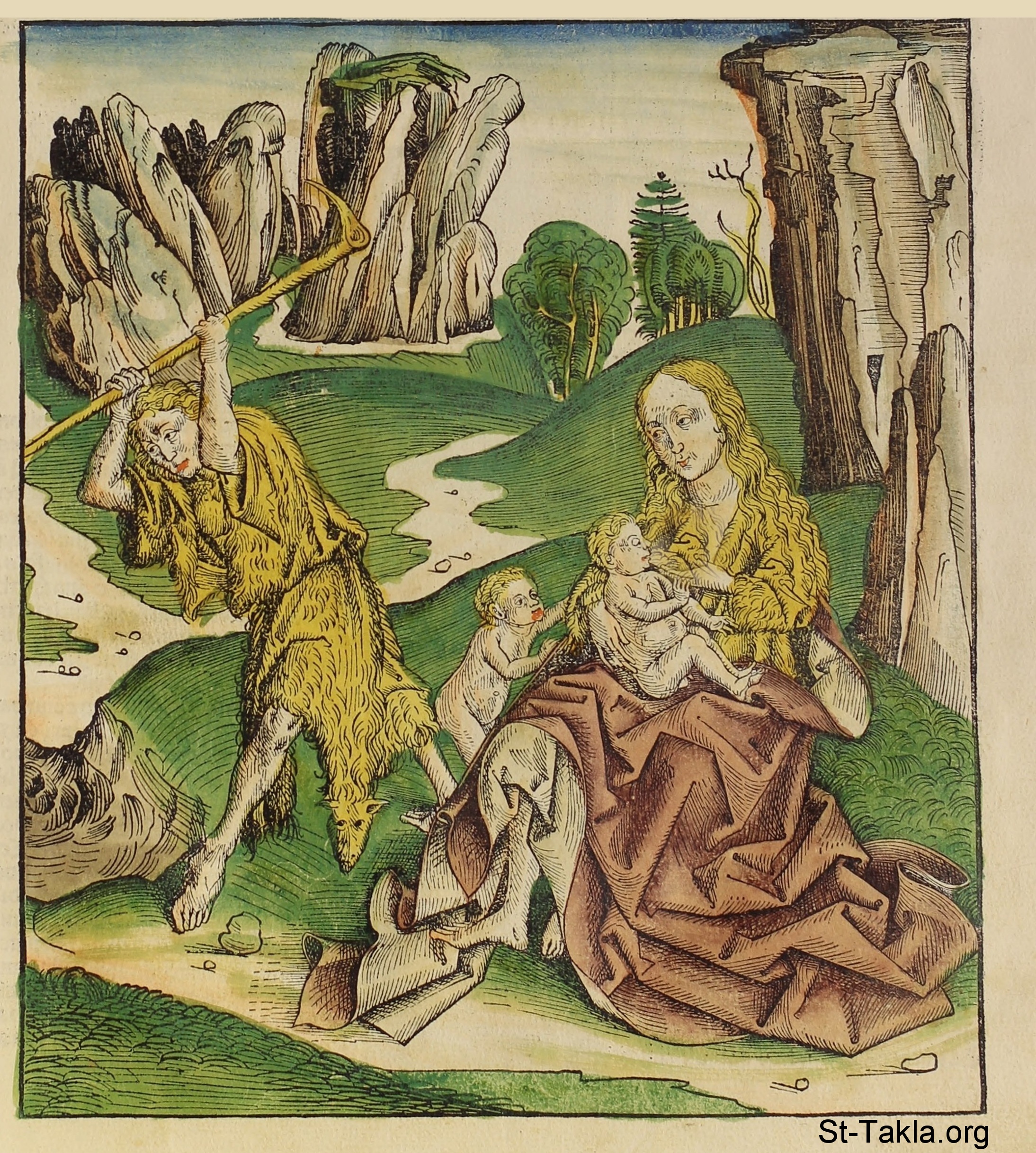 آدم وحواء بعد الطرد مع ابنيهما: قابيل وهابيل - من كتاب تاريخ نورنبيرج، بقلم هارتمان شيدل، 1493 م.