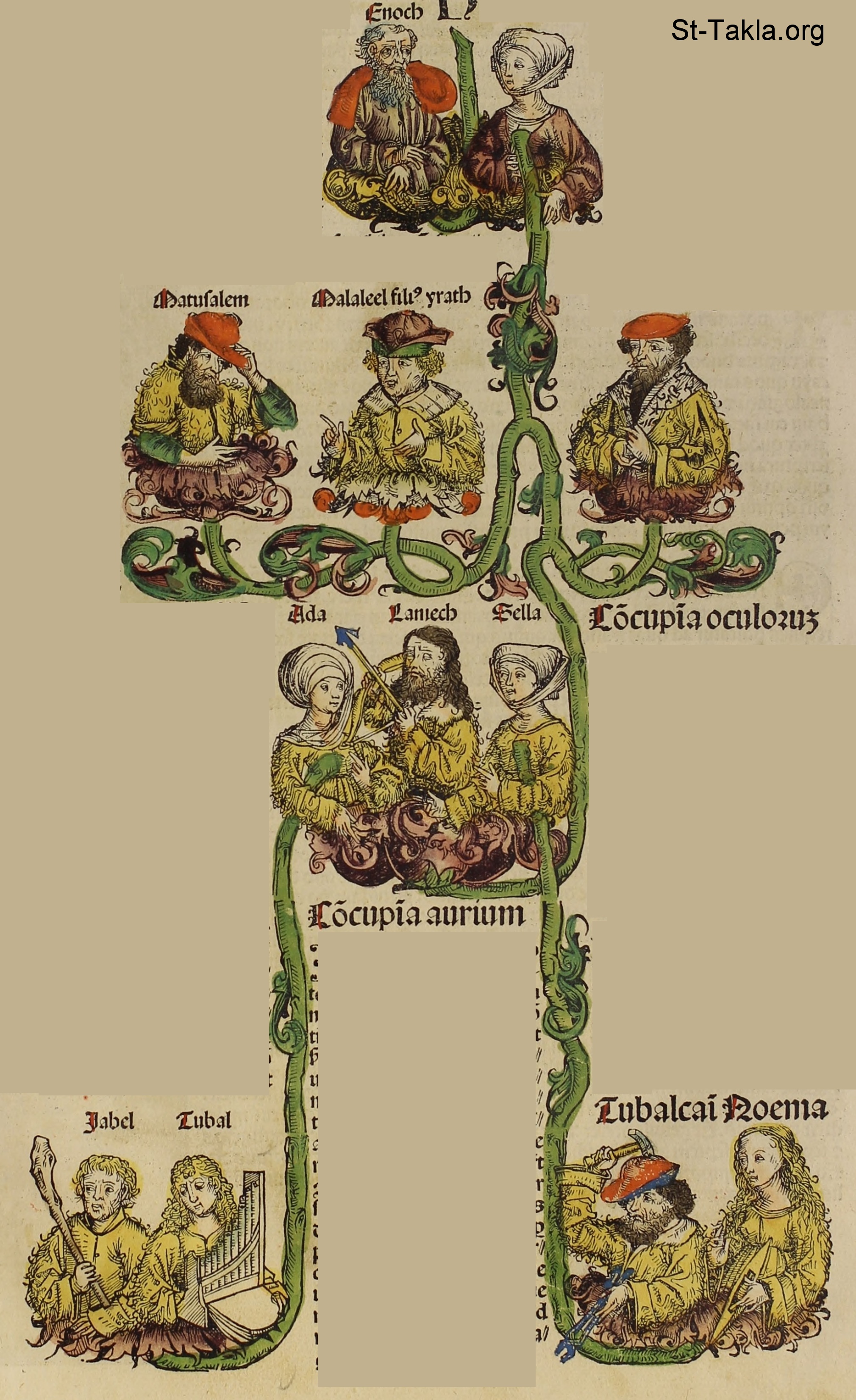 حنوك وزوجته - متوشائيل - عادة - لامك - صلة - مهللئيل أبو يارد - يارد أبو أخنوخ - يابال ويوبال ابني لامك من عادة - توبال قايين ونعمة أبناء لامك من صلة - من كتاب تاريخ نورنبيرج، بقلم هارتمان شيدل، 1493 م.