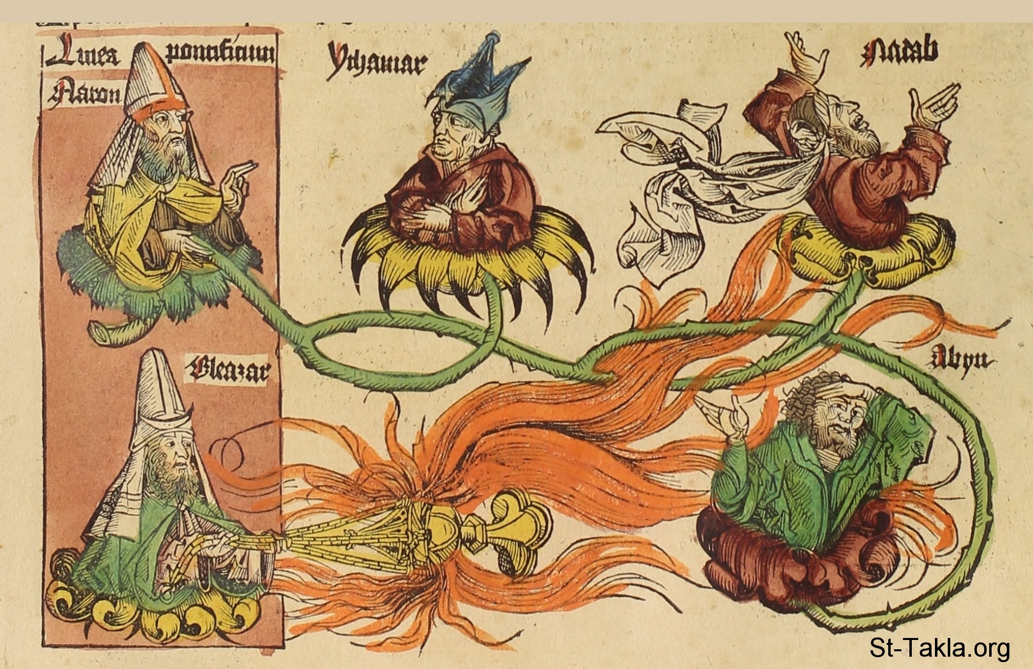 هارون وابنه ألعازار. وبنو هرون الآخرون إيثامار وناداب وأبيهو - من كتاب تاريخ نورنبيرج، بقلم هارتمان شيدل، 1493 م.
