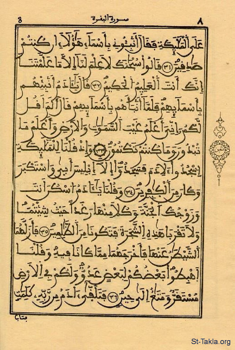 جزء من (سورة البقرة 31-36)، وبها آيات عن آدم وحواء، عصيان الشيطان، وراثة الخطية الأصلية - من كتاب مصحف القرآن الكريم، الخطاط محمد السفاتي، الجزائر، 1931 م.