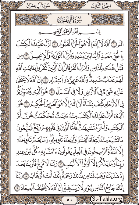3. سورة آل عمران، وبأولها ذكر التوراة والإنجيل (الكتاب المقدس - آية 3) - من كتاب مصحف القرآن الكريم المبروز - (صورة 50).