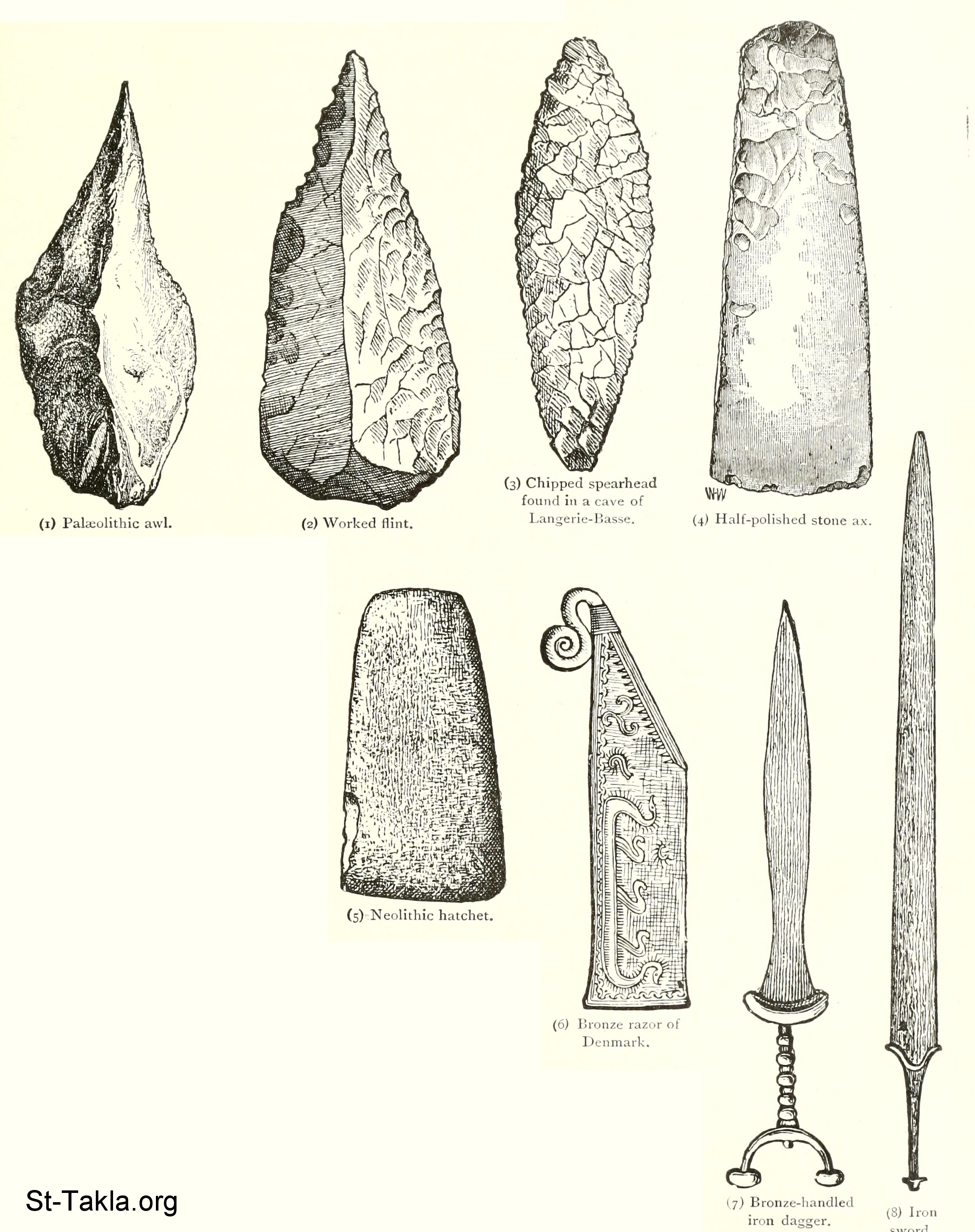 ثماني مراحل تقدمية من التطور البشري ، موضحة في التصنيع ومواد الأدوات: 1: المخرز من العصر الحجري القديم. - 2: صوان مستعمل. - 3: رأس حربة مقطوع تم العثور عليه في كهف لانجري باس. - 4: فأس حجري نصف مصقول - 5: بلطة من العصر الحجري الحديث - 6: شفرة برونزية من الدنمارك. 7: خنجر حديدي بيد برونزية. - 8: سيف حديدي - عن كتاب التاريخ العالمي لريدباث: جزء 1، موسوعة، جون كلارك ريدباث، 1895 م.