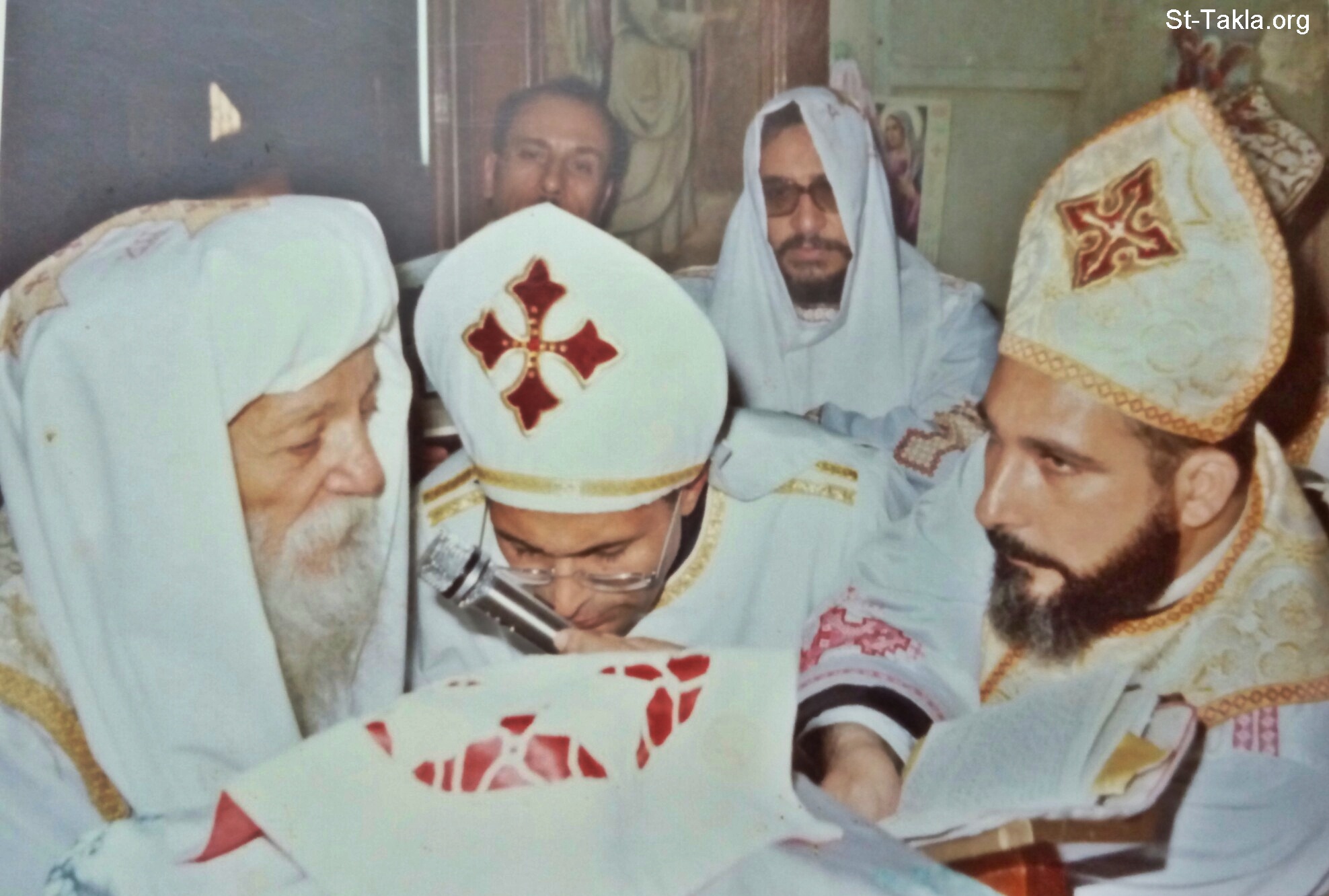 نيافة الحبر الجليل الأنبا ابرآم الثاني أسقف الفيوم، مصر (1951-1986 م.)، ومعه القمص يوحنا اسكندر (أقصي اليمين)