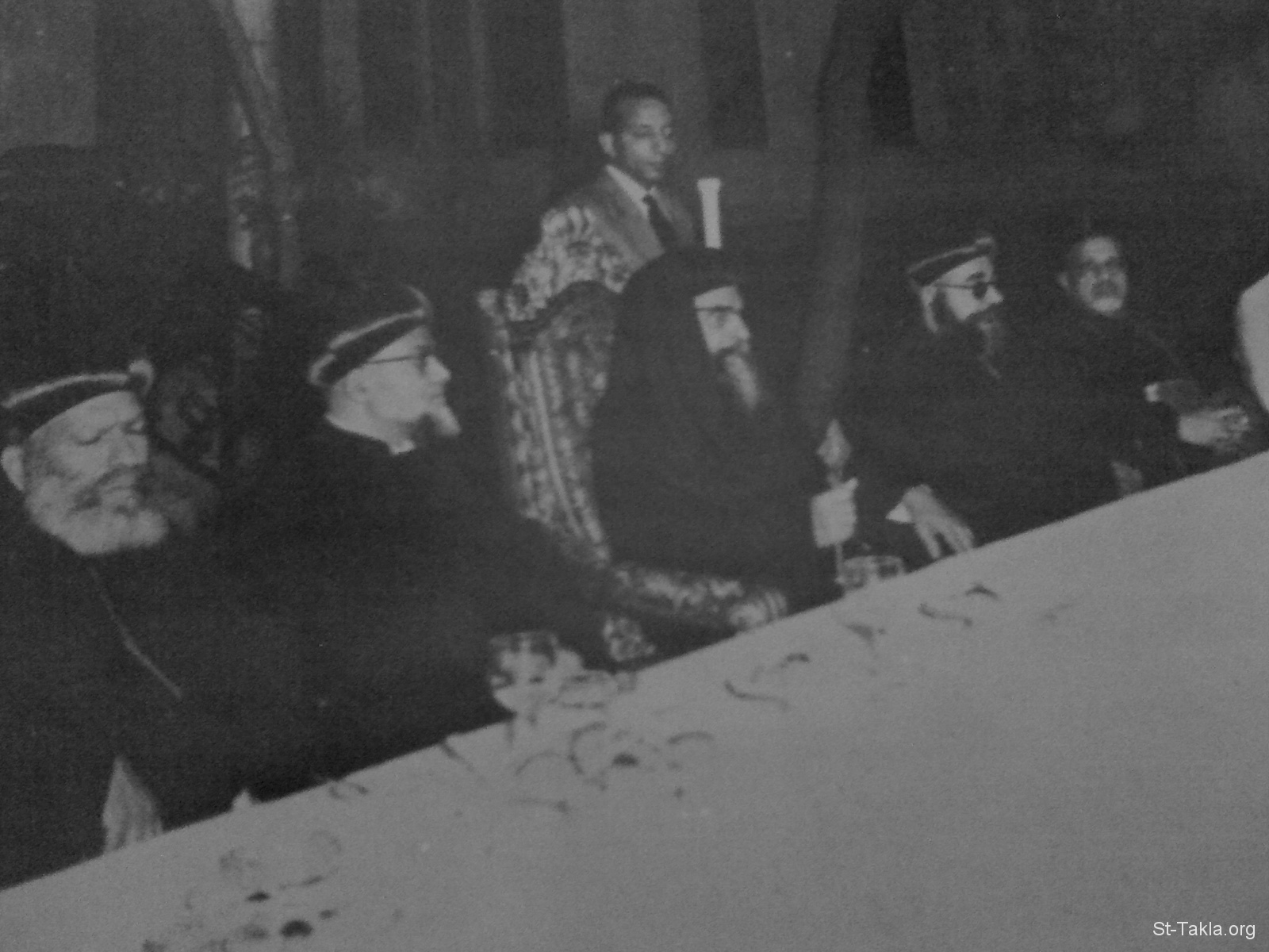 قداسة الأنبا البابا كيرلس السادس، بابا الإسكندرية وبطريرك الكرازة المرقسية رقم 116 في حفل الاستقبال البسيط في فناء البطريركية بمناسبة اعتلائه الكرسي المرقسي يوم 10-5-1959، ويبدو في الصورة رؤساء بعض الطوائف المسيحية، ويظهر كذلك نيافة الحبر الجليل الأنبا ثاؤفيلس أسقف دير السريان المتنيح (الأول على اليسار)، ويقف شماس البابا وهو يمسك عصا رعاية البطريرك، وهو الذي أصبح لاحقًا راهبًا ثم أسقفًا باسم الأنبا مينا رئيس دير مارمينا بمريوط (تنيح)