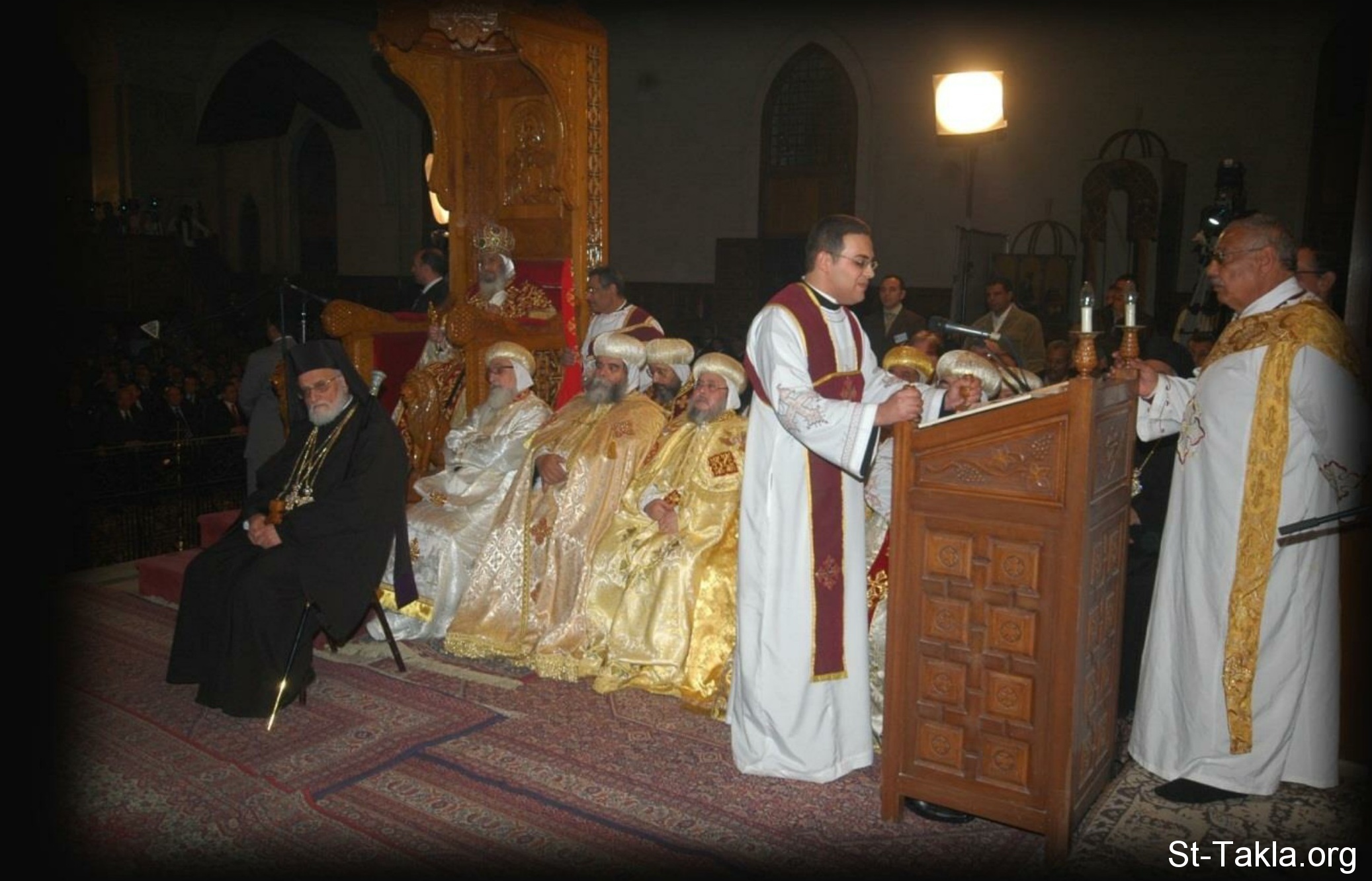 صورة أرشيفية تبين شماس يقف علي المنجلية ليرنم منفردًا "لحن البولس" والجميع ينصت - ويظهر البابا شنوده الثالث جالسًا على العرش.