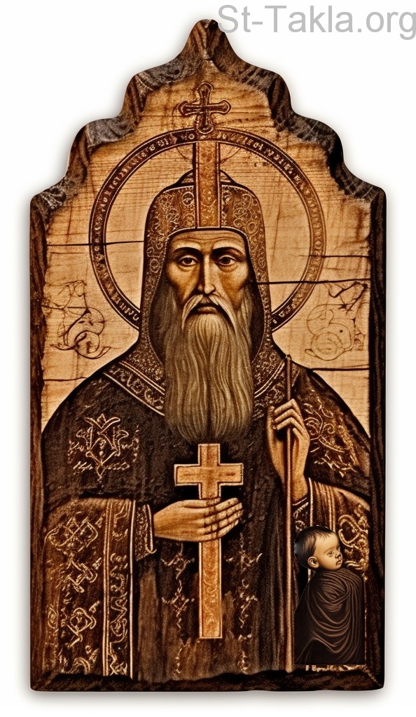 قداسة البابا يعقوب البطريرك الخمسون من بطاركة الكرازة المرقسية: 50، ويظهر بأسفل صورة الطفل الرضيع الذي أقامه البابا من الموت بمعجزة. - فن بالذكاء الاصطناعي، فكرة وتعديل مايكل غالي لموقع الأنبا تكلاهيمانوت، أكتوبر 2023 م.