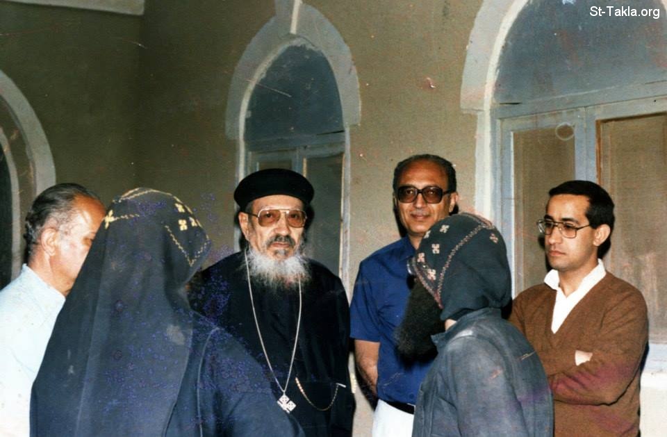 أبونا القمص مرقس غالي في دير الأنبا صمؤئيل المعترف بالقلمون، وإلى اليمين المهندس طلعت جبره (القس مكسيموس جبره - بالملابس البنية) كاهن كنيسة الملاك ميخائيل، طوسون، وبجانبهم الأستاذ مراد مرقس.