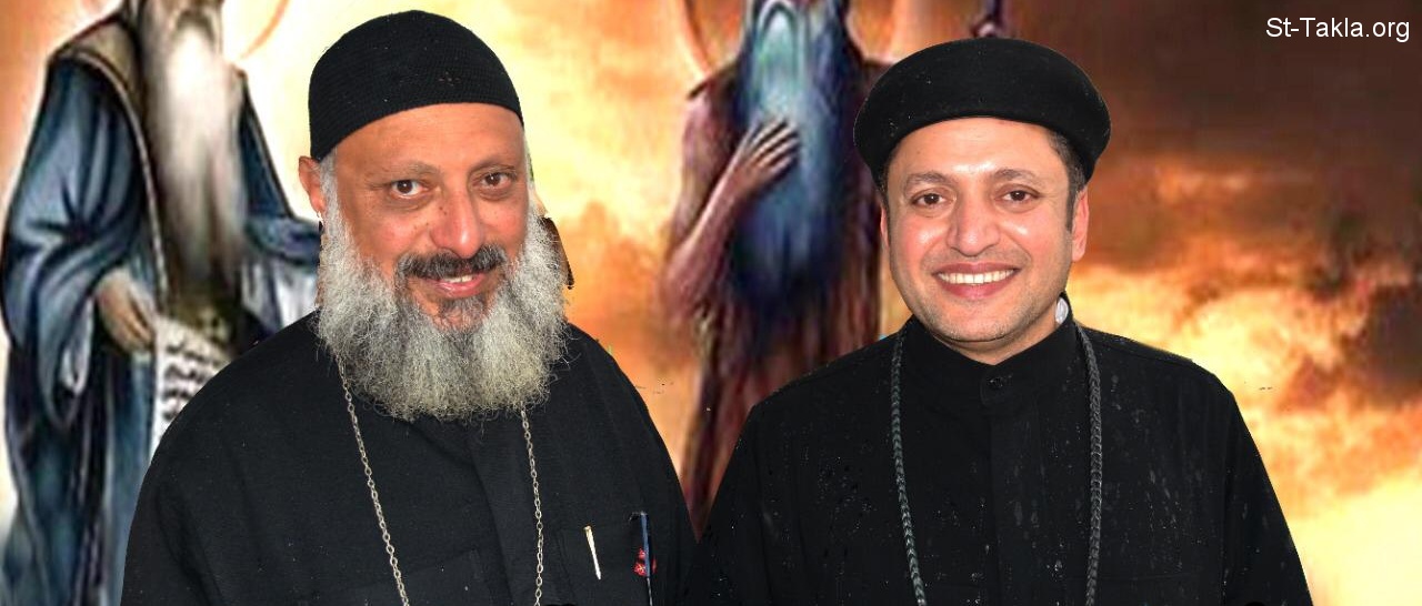 من اليسار لليمين: قدس أبونا القس أنطونيوس موريس فرج الله - قدس أبونا القس بولا جرجس إبراهيم، كهنة كنيسة السيدة العذراء مريم ومارجرجس القبطية الأرثوذكسية، مدينتي، شرق القاهرة، مصر.