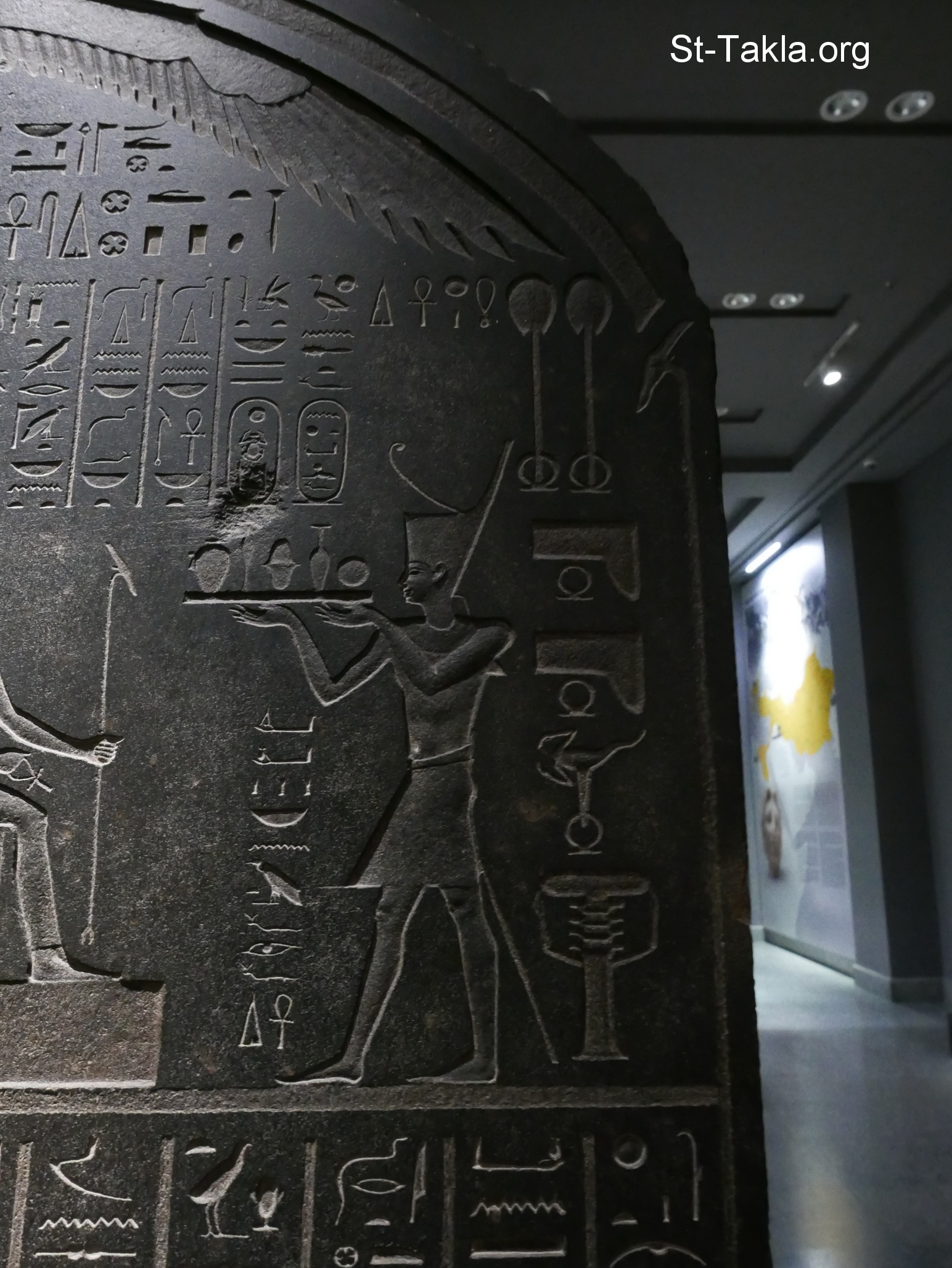 Stela of Naukratis and Herakleion-Thonis (image 4): Two identical stelae were found on both sides of the Canopic branch of the Nile, date back to the reign of King Nectanebo I (380-362 BC). It has 14 columns of text record a royal decree allocating 10 per cent of taxes on merchandise passing through the harbour of Herakleion-Thonis, in addition to similar transactions and local productions in Naukratis (now Kom Geif), to the temple of the goddess Neith (equivalent of Greek Athena) in Sais (Sa el-Hagar, Egypt). - Black basalt. - Greco-Roman Museum, Alexandria, Egypt - Photograph by Michael Ghaly for St-Takla.org, 24 July 2025.
