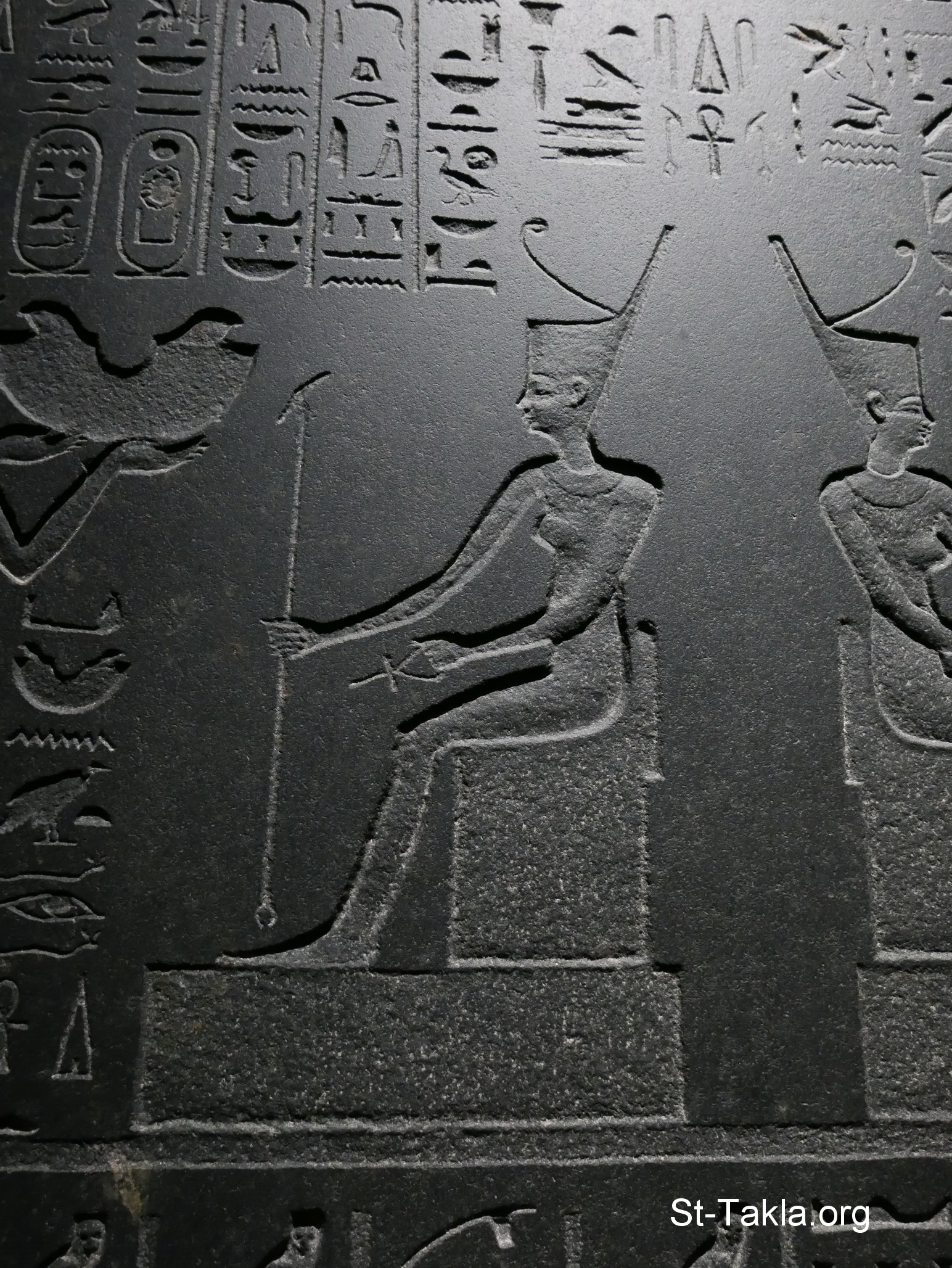 Stela of Naukratis and Herakleion-Thonis (image 14): Two identical stelae were found on both sides of the Canopic branch of the Nile, date back to the reign of King Nectanebo I (380-362 BC). It has 14 columns of text record a royal decree allocating 10 per cent of taxes on merchandise passing through the harbour of Herakleion-Thonis, in addition to similar transactions and local productions in Naukratis (now Kom Geif), to the temple of the goddess Neith (equivalent of Greek Athena) in Sais (Sa el-Hagar, Egypt). - Black basalt. - Greco-Roman Museum, Alexandria, Egypt - Photograph by Michael Ghaly for St-Takla.org, 24 July 2025.