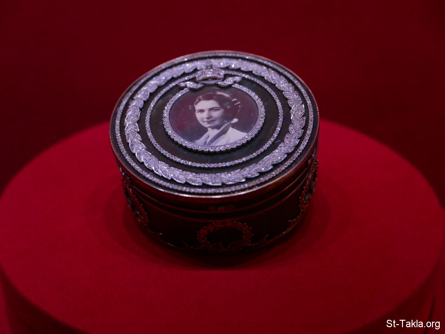علبة بغطاء مستديرة الشكل من العقيق الزيتي، حافة القاعدة بها حليات من الذهب وحدات متكررة على شكل غصن زيتون وفيونكة، ويتوسط سطح الغطاء صورة بالمينا الملونة للملكة فريدة داخل إطار من البلاتين مرصع بأحجار من الماس ويعلو الصورة تاج وهلال من البلاتين مرصعين بالماس - من من مقتنيات الملك فاروق - من صور متحف المجوهرات الملكية (الدور الثاني)، الإسكندرية، مصر - تصوير مايكل غالي لموقع الأنبا تكلاهيمانوت، 4 ديسمبر 2019 م.