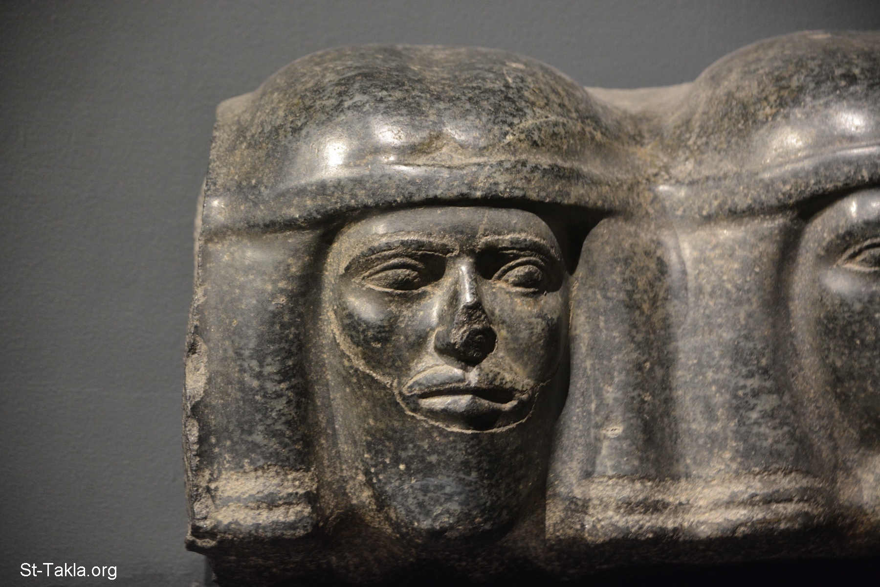 Corbel with Heads of Northern Foes (Asian): This piece is an architectural feature, which is better known from similar pieces dated to a Later Period. The Heads represent foreign prisoners, the traditional enemies of Egypt. - Black granite, Step Pyramid Complex (Pyramid of Djoser), Saqqara, 2680 BC. (photo 2) - Alexandria National Museum, Egypt (Ancient Egyptian Monuments) - Photograph by Michael Ghaly for St-Takla.org, November 13, 2019.