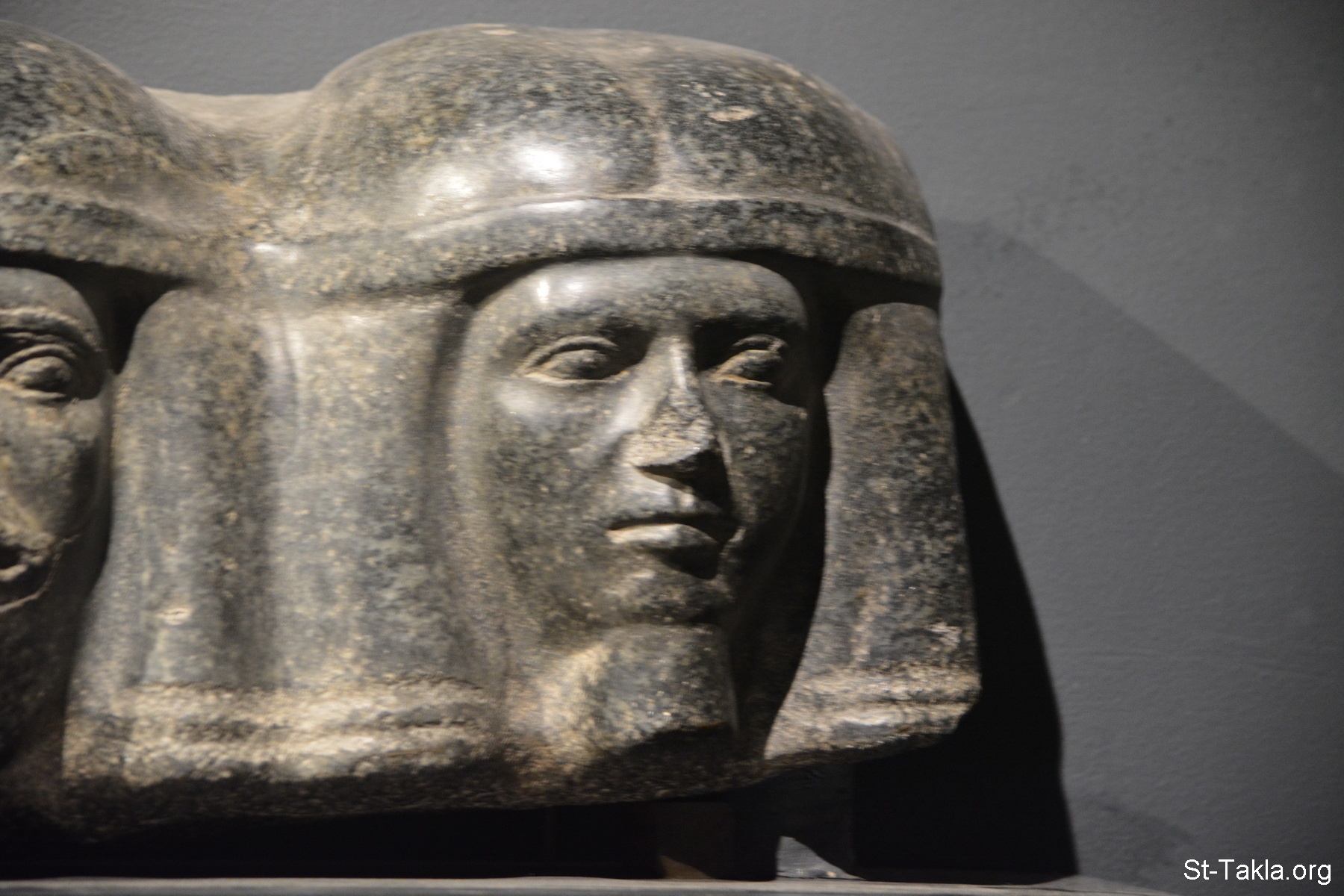 Corbel with Heads of Northern Foes (Asian): This piece is an architectural feature, which is better known from similar pieces dated to a Later Period. The Heads represent foreign prisoners, the traditional enemies of Egypt. - Black granite, Step Pyramid Complex (Pyramid of Djoser), Saqqara, 2680 BC. (photo 3) - Alexandria National Museum, Egypt (Ancient Egyptian Monuments) - Photograph by Michael Ghaly for St-Takla.org, November 13, 2019.