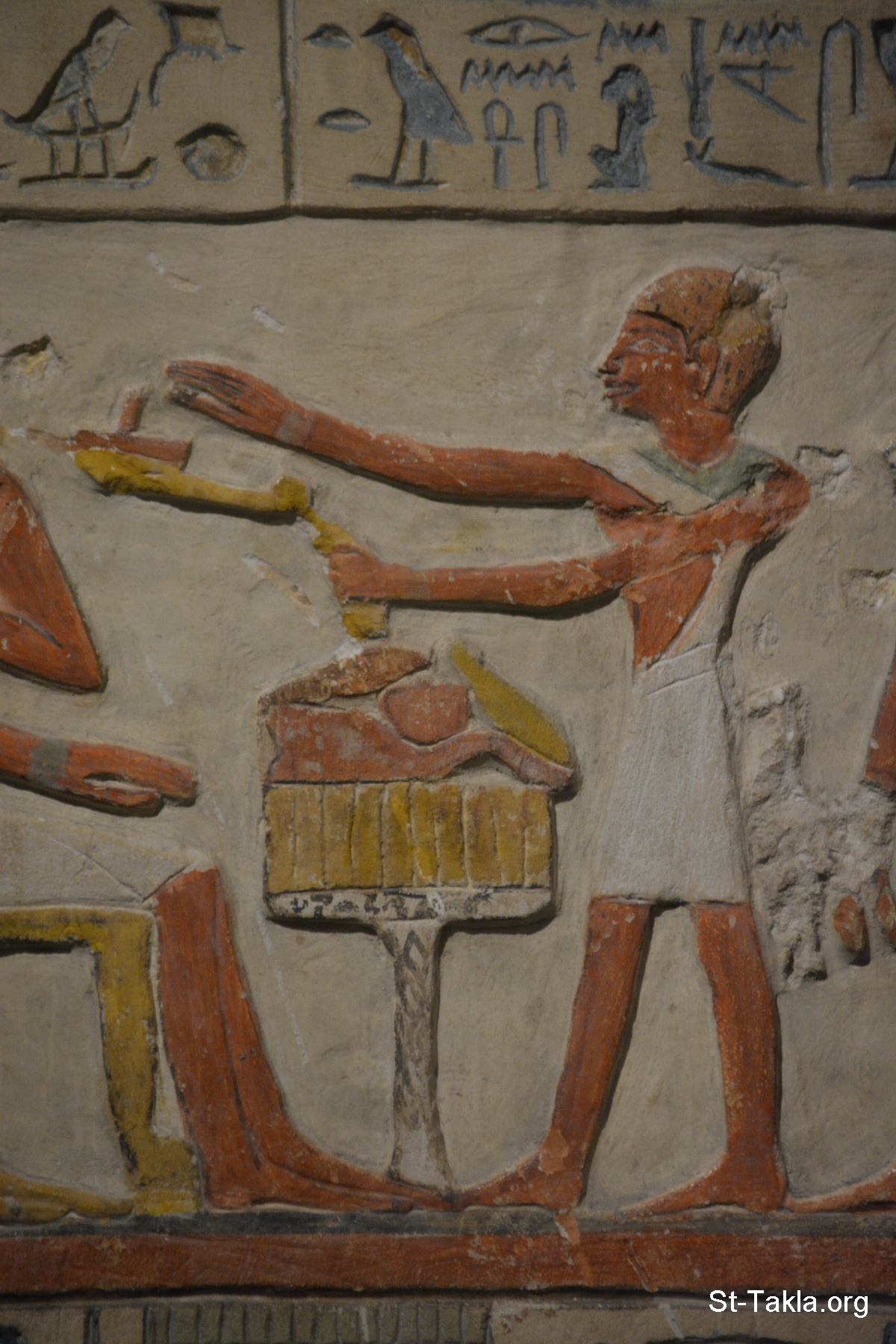 Stela of a dead man called "Nemti Emhat": The main inscription is divided into two parts by a vertical line, the left side showing the man and his wife in front of an offering, being presented by their sons, and at the bottom there is a false door, and behind them are two offering bearers - Painted limestone, Middle Kingdom (Abydos) (details 11) - Alexandria National Museum, Egypt (Ancient Egyptian Monuments) - Photograph by Michael Ghaly for St-Takla.org, November 13, 2019.