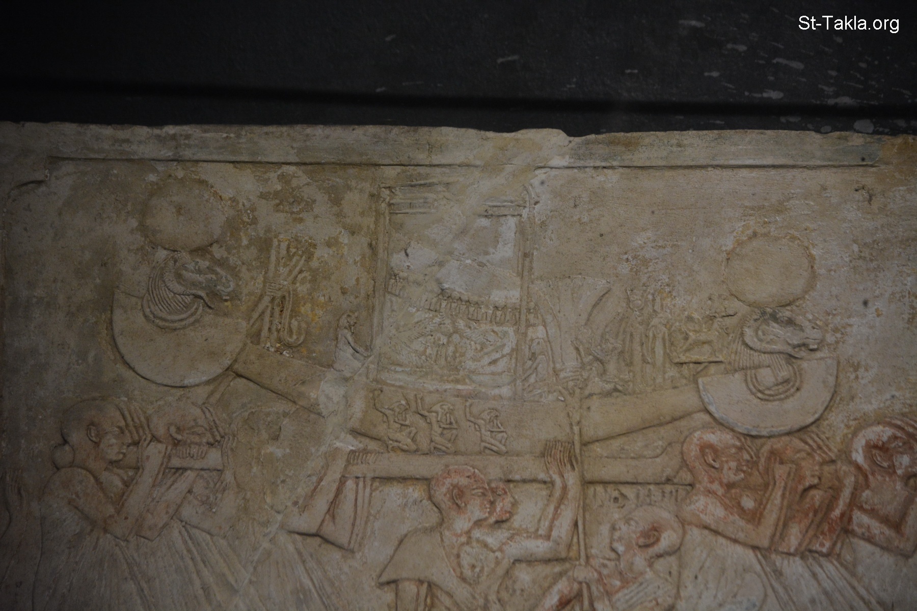 Walla relief of the priest Ameneminet, from a tomb or offering-chapel, probably in Thebes. In the upper register we see an official/king? (Userhat) is burning incense before the sacred barque (boat) of Amun-Ra, which is being carried by priests. A priest, perhaps Ameneminet follows behind. In the lower register Ameneminet is shown kneeling and praying in the barque of Amun-Re, the words of his prayer inscribed in front of him (details 4) - Alexandria National Museum, Egypt (Ancient Egyptian Monuments) - Photograph by Michael Ghaly for St-Takla.org, November 13, 2019.