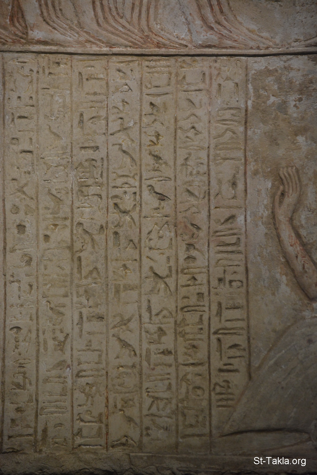 Walla relief of the priest Ameneminet, from a tomb or offering-chapel, probably in Thebes. In the upper register we see an official/king? (Userhat) is burning incense before the sacred barque (boat) of Amun-Ra, which is being carried by priests. A priest, perhaps Ameneminet follows behind. In the lower register Ameneminet is shown kneeling and praying in the barque of Amun-Re, the words of his prayer inscribed in front of him (details 7) - Alexandria National Museum, Egypt (Ancient Egyptian Monuments) - Photograph by Michael Ghaly for St-Takla.org, November 13, 2019.