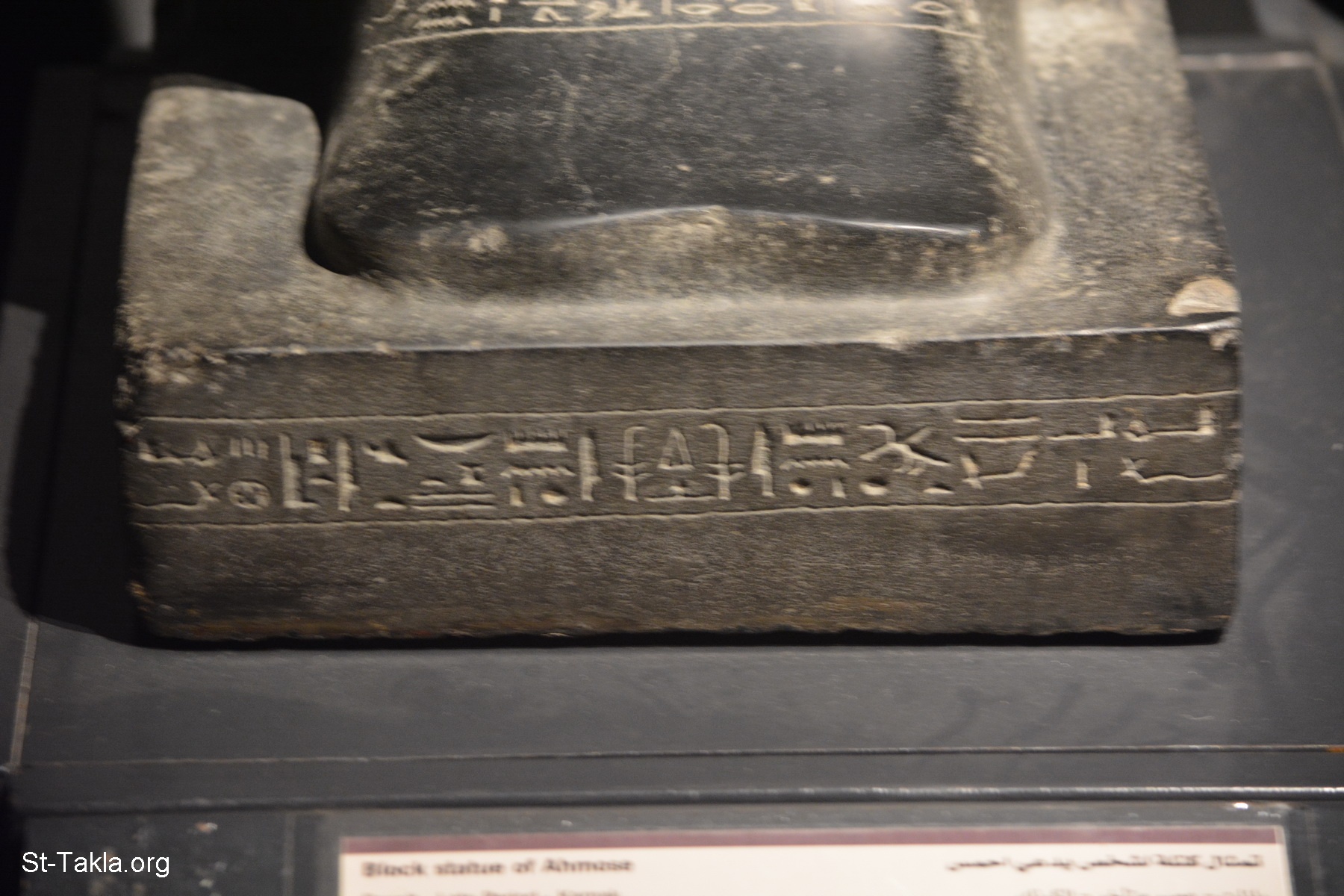 A block statue of a man called "Ahmose", with inscriptions of the dead man's names and titles - basalt, Late Period, Karnak (details 2) - Alexandria National Museum, Egypt (Ancient Egyptian Monuments) - Photograph by Michael Ghaly for St-Takla.org, November 13, 2019.