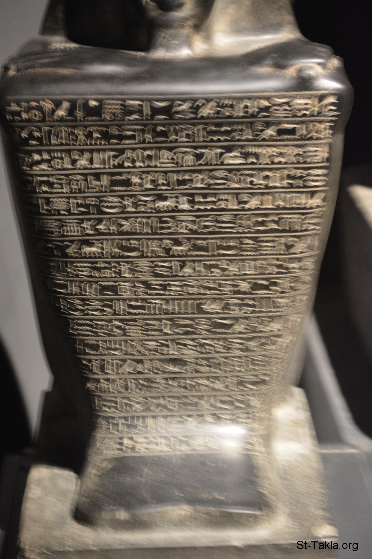 A block statue of a man called "Ahmose", with inscriptions of the dead man's names and titles - basalt, Late Period, Karnak (details 3) - Alexandria National Museum, Egypt (Ancient Egyptian Monuments) - Photograph by Michael Ghaly for St-Takla.org, November 13, 2019.