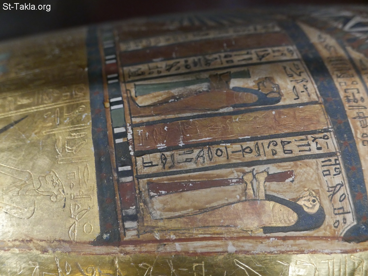Coffin and a mummy board (one includes a mummy for a person called "Pakhel", plastered and painted wood, Late Period (details 130) - Alexandria National Museum, Egypt (The Tomb: Ancient Egyptian Monuments) - Photograph by Michael Ghaly for St-Takla.org, May 2, 2012/November 13, 2019.