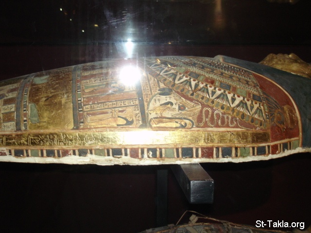 Coffin and a mummy board (one includes a mummy for a person called "Pakhel", plastered and painted wood, Late Period (details 141) - Alexandria National Museum, Egypt (The Tomb: Ancient Egyptian Monuments) - Photograph by Michael Ghaly for St-Takla.org, May 2, 2012/November 13, 2019.