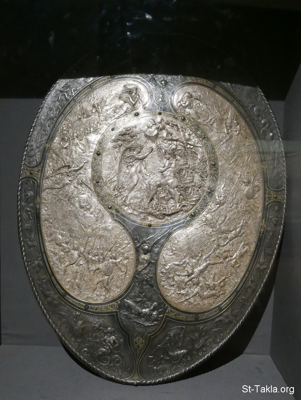 درع فضي رائع، ربما من مخلفات الحملة الفرنسية على مصر وسوريا (1798–1801)، وبه زخارف مشاهد طرد آدم وحواء من الجنة بواسطة الملاك، اليوم الأخير: الدينونة، الملاك ميخائيل يهزم الشيطان (صورة 1) - من صور متحف الإسكندرية القومي، مصر (قسم الآثار القبطية/الإسلامية/المصرية الحديثة) - تصوير مايكل غالي لموقع الأنبا تكلاهيمانوت، 13 نوفمبر 2019 م.