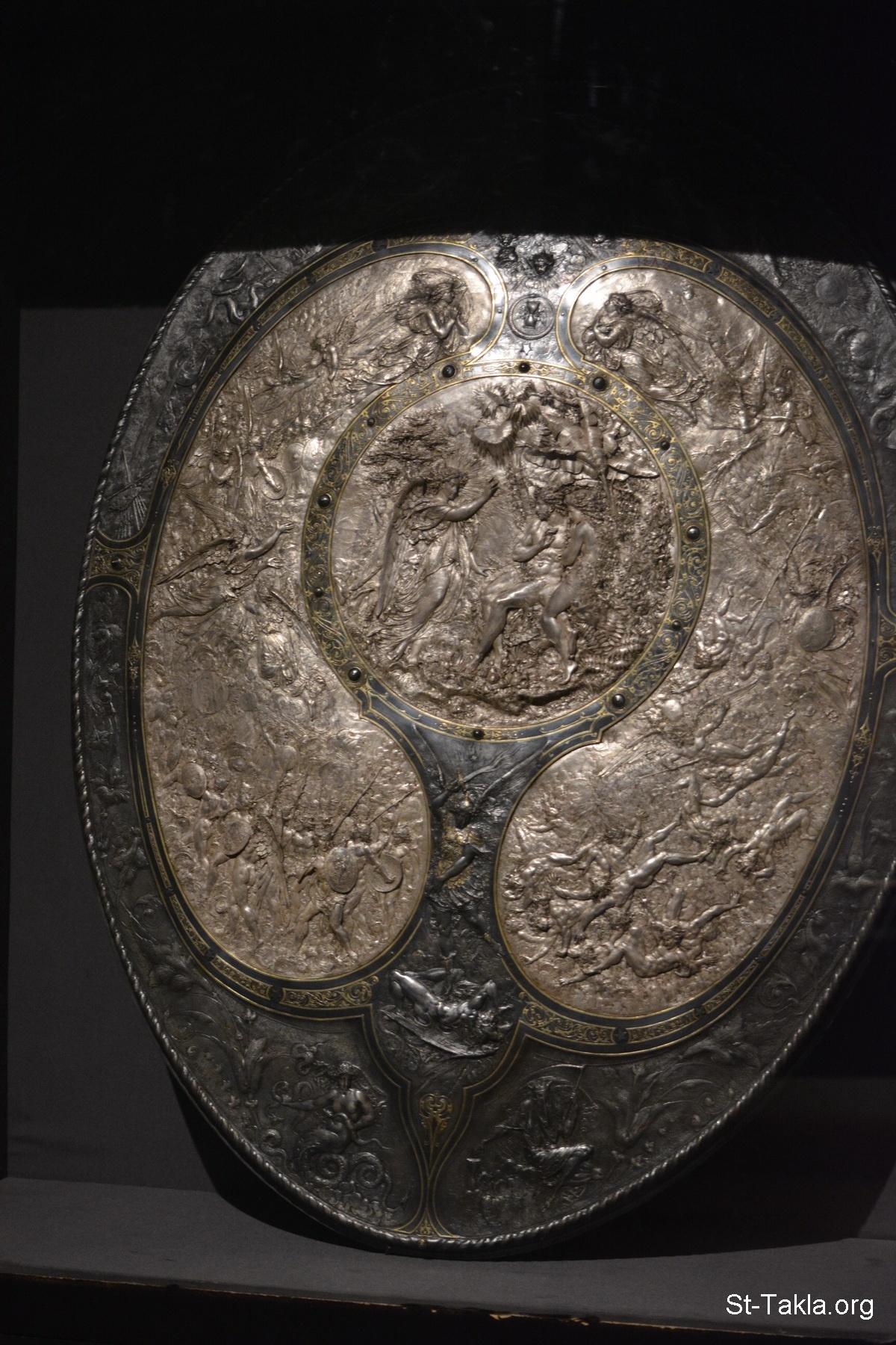 An exquisite silver shield, probably lost from the time of the French campaign in Egypt and Syria (1798–1801), with decorations of the expulsion of Adam and Eve by the Angel, the Last Judgement, Archangel Michael defeating Satan (photo 3) - Alexandria National Museum, Egypt (Coptic/Islamic/Modern Egyptian Monuments) - Photograph by Michael Ghaly for St-Takla.org, November 13, 2019.