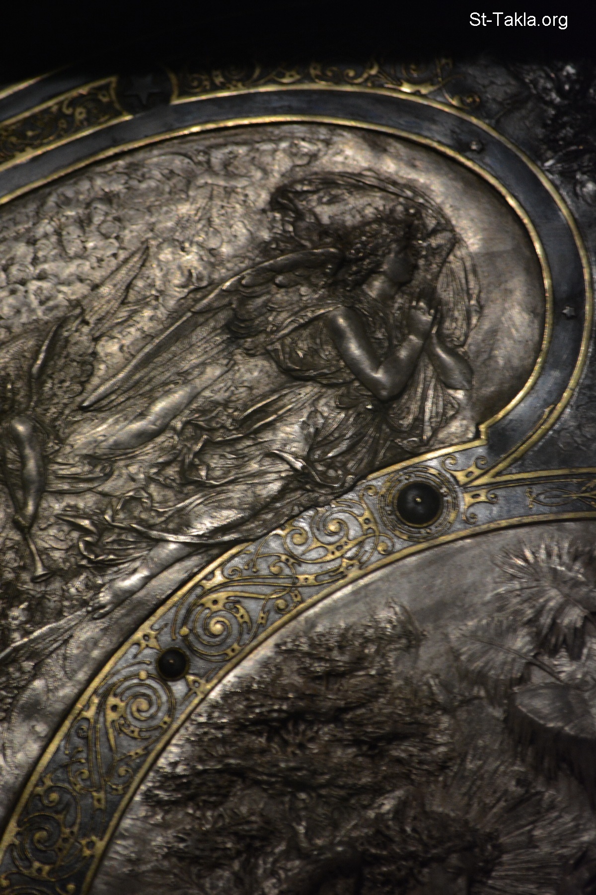 An exquisite silver shield, probably lost from the time of the French campaign in Egypt and Syria (1798–1801), with decorations of the expulsion of Adam and Eve by the Angel, the Last Judgement, Archangel Michael defeating Satan (details 9) - Alexandria National Museum, Egypt (Coptic/Islamic/Modern Egyptian Monuments) - Photograph by Michael Ghaly for St-Takla.org, November 13, 2019.