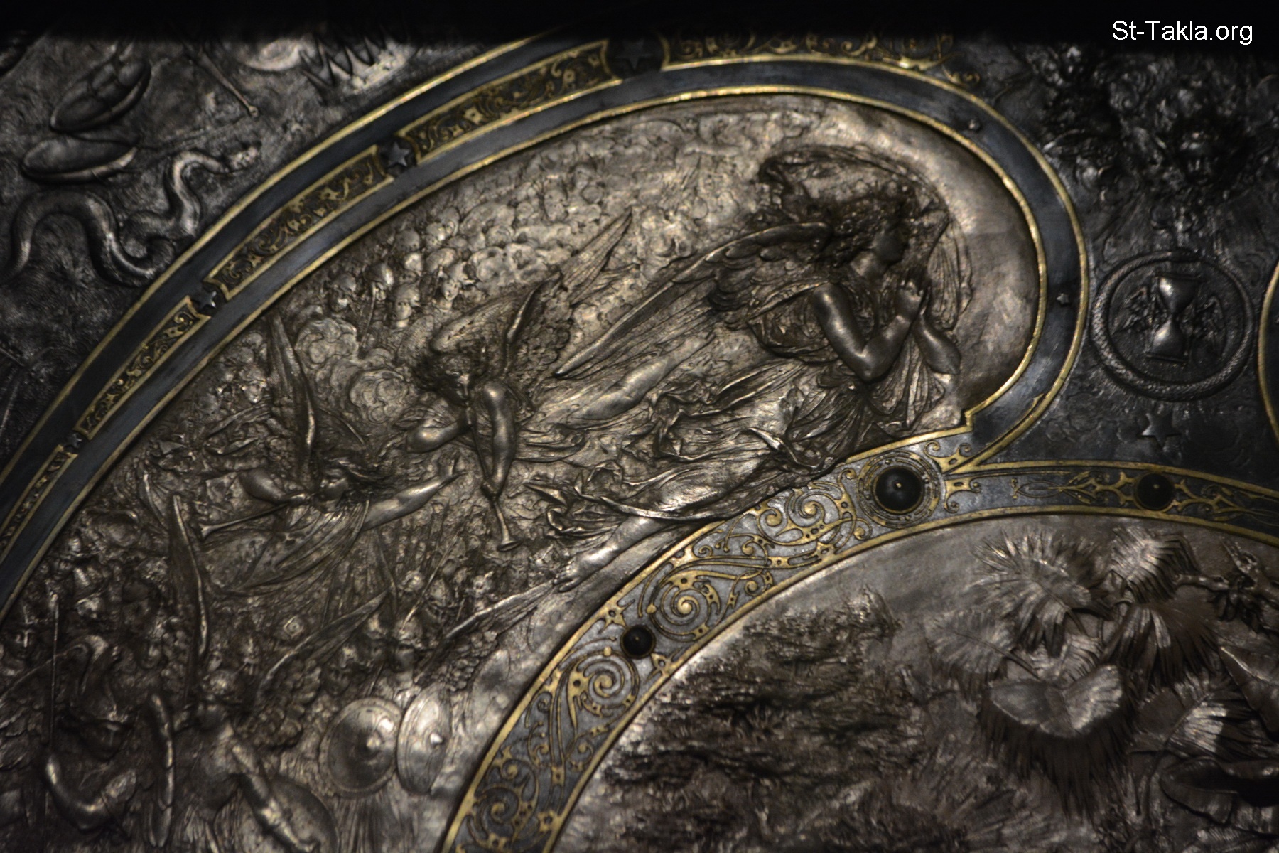 An exquisite silver shield, probably lost from the time of the French campaign in Egypt and Syria (1798–1801), with decorations of the expulsion of Adam and Eve by the Angel, the Last Judgement, Archangel Michael defeating Satan (details 10) - Alexandria National Museum, Egypt (Coptic/Islamic/Modern Egyptian Monuments) - Photograph by Michael Ghaly for St-Takla.org, November 13, 2019.