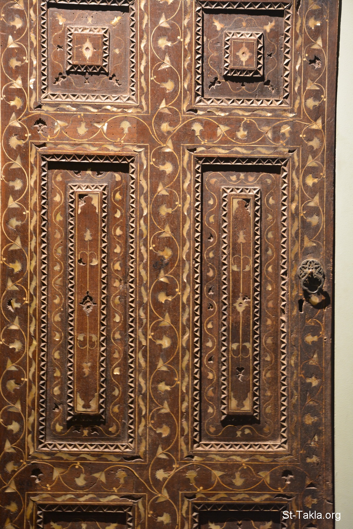 Door lock decorated with simple Arabesque work of carnation inlaid with mother-of-pearl, Ottoman, 19th century a.D., Alexandria, Terbana Waqf. (photo 2) - Alexandria National Museum, Egypt (Coptic/Islamic/Modern Egyptian Monuments) - Photograph by Michael Ghaly for St-Takla.org, November 13, 2019.
