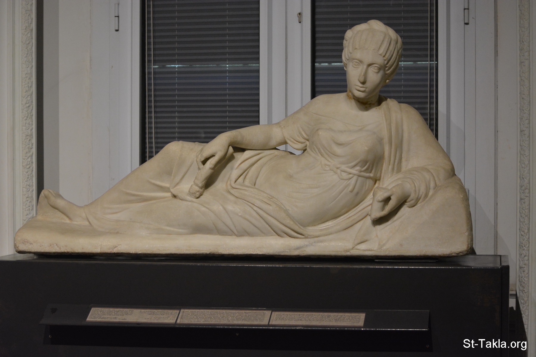 تمثال غطاء تابوت يمثل سيدة مضطجعة على مسندة - المادة: رخام - العصر: العصر الروماني، حوالي سنة 150 ق. م. - المصدر: المجمرة، سيدي بشر، الإسكندرية، مصر (صورة 1) - من صور متحف الإسكندرية القومي، مصر (قسم الآثار اليونانية الرومانية) - تصوير مايكل غالي لموقع الأنبا تكلاهيمانوت، 13 نوفمبر 2019 م.
