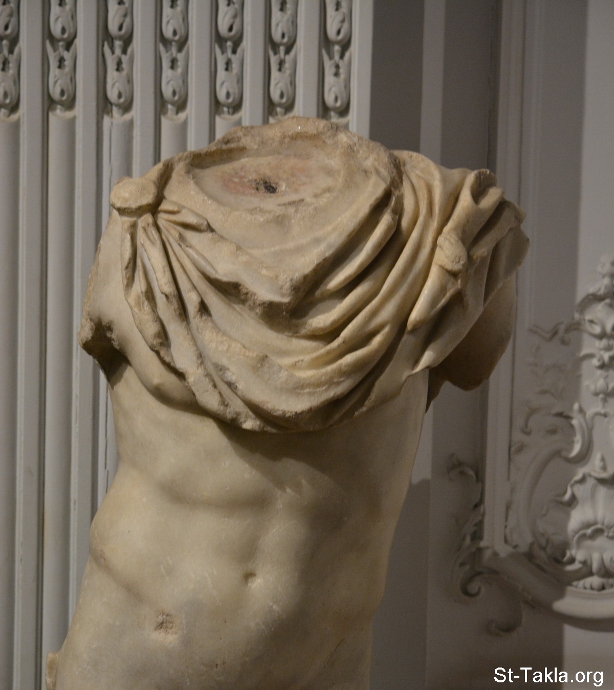 جذع تمثال للإله هيرميس يرتدي معطفًا به بروش، وتظهر به عظام القفص الصدري (حيث أن هذه التماثيل يُطلق عليها "تماثيل التشريح"، وقد اشتهرت بها مدرسة الإسكندرية في النحت) - من العصر الهلنستي (صورة 1) - من صور متحف الإسكندرية القومي، مصر (قسم الآثار اليونانية الرومانية) - تصوير مايكل غالي لموقع الأنبا تكلاهيمانوت، 13 نوفمبر 2019 م.