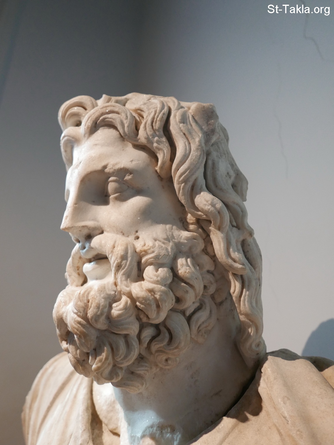 الجزء العلوي من تمثال رخامي ضخم يصور الإله سيرابيس، المعبود الرسمي لمدينة الإسكندرية طوال العصرين اليوناني والروماني، وكان أحد أعضاء الثالوث السكندري المقدس: سيرابيس، إيزيس، حربوقراط. الرأس منفصلة عن جسم التمثال، ويوجد على جانبيّ الكتفين ثقوب لتثبيت الذراعين، العصر: هلنستي (صورة 00000) - من صور متحف الإسكندرية القومي، مصر (قسم الآثار اليونانية الرومانية) - تصوير مايكل غالي لموقع الأنبا تكلاهيمانوت، 13 نوفمبر 2019 م.