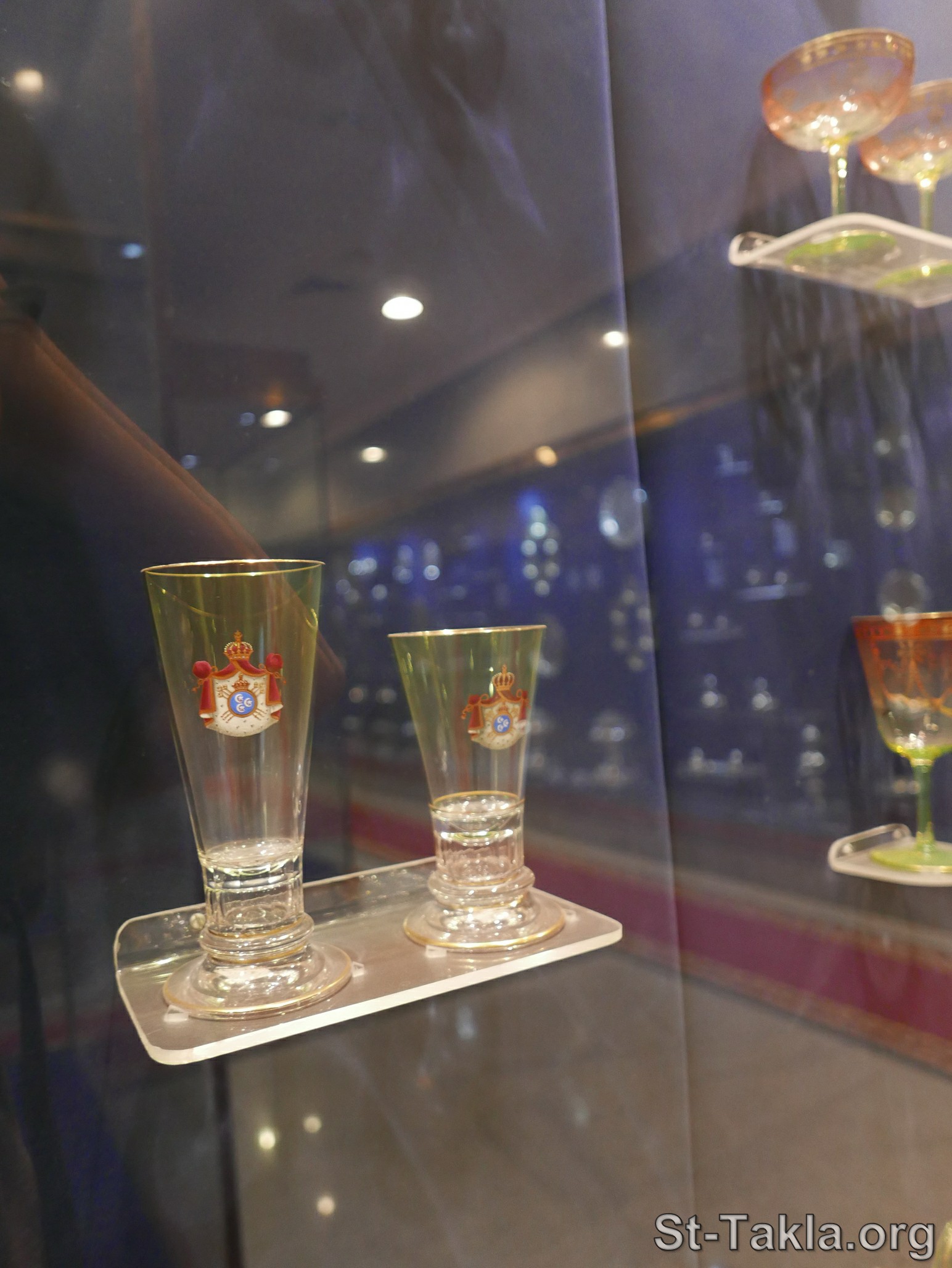 From the collection of Khedive Ismail and Khedive Abbas Helmy II: 19th century: A group of a beverage set, consisting of flasks, jugs, decanters, cups of different sizes, in colors ranging from pistachio to light burgundy, and decorated with delicate floral decorations and the royal crown, some of which have the letter “A” on them. - Silver Museum (image 331), at Abdeen Palace Museums, Cairo, Egypt - Photograph by Michael Ghaly for St-Takla.org, 25 November 2023.
