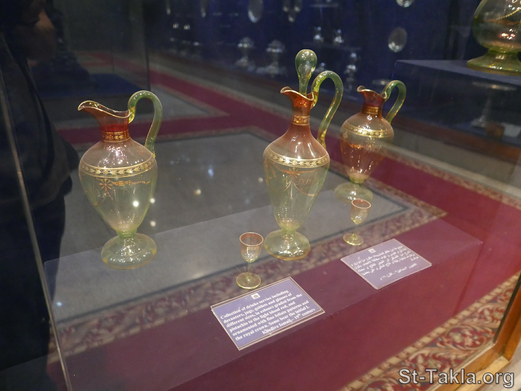 From the collection of Khedive Ismail and Khedive Abbas Helmy II: 19th century: A group of a beverage set, consisting of flasks, jugs, decanters, cups of different sizes, in colors ranging from pistachio to light burgundy, and decorated with delicate floral decorations and the royal crown, some of which have the letter “A” on them. - Silver Museum (image 333), at Abdeen Palace Museums, Cairo, Egypt - Photograph by Michael Ghaly for St-Takla.org, 25 November 2023.
