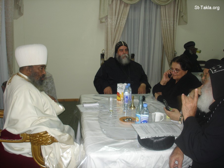 Left to right: Abune Paulos, Bishop Botrous, Mrs. Nadia Bebawi, Abona Pishoy, Bishop Markos - Dinner with Abune Paulos at the Ethiopian Patriarchate in Addis Ababa - Photograph by Michael Ghaly for St-Takla.org, during the website's visit to Ethiopia, April-June 2008.