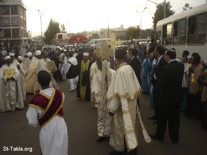 حمل صليب الزفة - احتفالية كنيسة الثالوث (سيلاسي) في أديس أبابا بحضور قداسة البابا شنوده الثالث، إبريل 2008 - تصوير مايكل غالي لموقع الأنبا تكلاهيمانوت، من رحلة موقع الأنبا تكلا إلى إثيوبيا، إبريل - يونيو 2008 م.