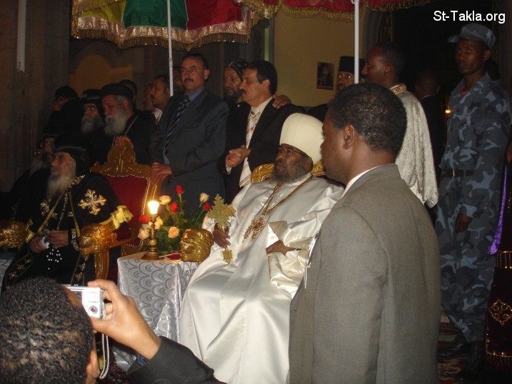 بعد الساعة السابعة مساء - أو الواحدة مساء بالتوقيت الأثيوبي - احتفالية كنيسة الثالوث (سيلاسي) في أديس أبابا بحضور قداسة البابا شنوده الثالث، إبريل 2008 - تصوير مايكل غالي لموقع الأنبا تكلاهيمانوت، من رحلة موقع الأنبا تكلا إلى إثيوبيا، إبريل - يونيو 2008 م.