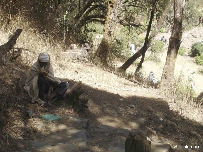 راهب على الطريق يقرأ كتاب مقدس - دير ديبرا ليبانوس، من صور رحلة موقع الأنبا تكلا لإثيوبيا - من ألبوم صور دير ديبراليبانوس في عيد نقل جسد الأنبا تكلاهايمانوت، مايو 2008 - تصوير مايكل غالي لموقع الأنبا تكلاهيمانوت، من رحلة موقع الأنبا تكلا إلى إثيوبيا، إبريل - يونيو 2008 م.