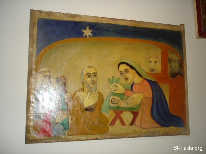ميلاد المسيح، لوحة زيتية على قماش، 1974 حسب التقويم الحبشي - من ألبوم صور متحف جامعة أديس أبابا بالحبشة - تصوير مايكل غالي لموقع الأنبا تكلاهيمانوت، من رحلة موقع الأنبا تكلا إلى إثيوبيا، إبريل - يونيو 2008 م.