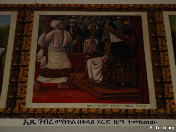 Youth of Saint Yared, feeling sad from over learning Psalms, and looking at the Caterpillar's perseverance in climbing the tree - Bole Medhane Alem Church, Addis Ababa - from St-Takla.org's Ethiopia visit - Photograph by Michael Ghaly for St-Takla.org, April-June 2008.
