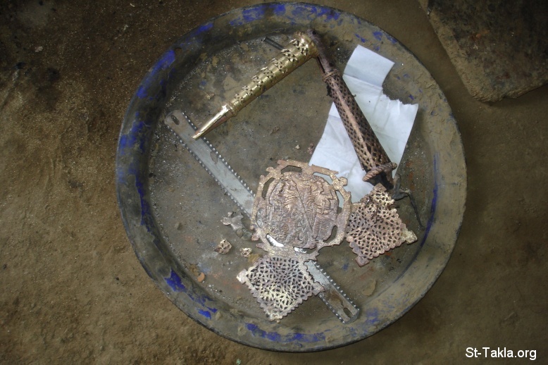 Another cross with the engravings of Saint George the Roman - Making artifacts, Axum - From St-Takla.org's Ethiopia visit - Photograph by Michael Ghaly for St-Takla.org, April-June 2008.