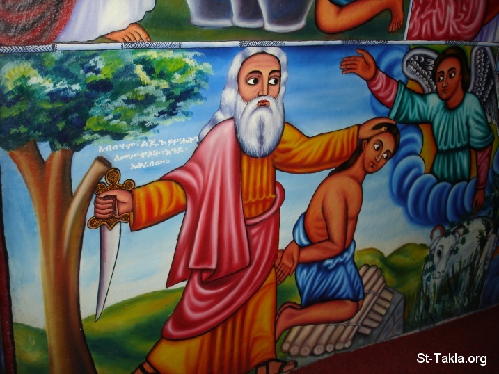 ذبح إسحق عن طريق أبيه إبراهيم، أيقونة حبشية - من ألبوم صور أديرة بحيرة تانا، بحردار، الحبشة - تصوير مايكل غالي لموقع الأنبا تكلاهيمانوت، من رحلة موقع الأنبا تكلا إلى إثيوبيا، إبريل - يونيو 2008 م.