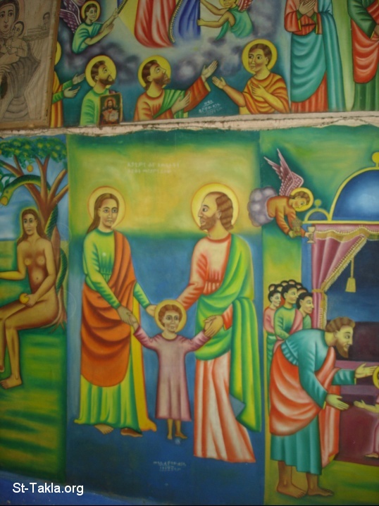 العائلة المقدسة: القديس يوسف نجار، قديسة مريم، يسوعالمسيح - من ألبوم صور كنيسة العذراء مريم سيدة قسقام، جوندر، الحبشة - تصوير مايكل غالي لموقع الأنبا تكلاهيمانوت، من رحلة موقع الأنبا تكلا إلى إثيوبيا، إبريل - يونيو 2008 م.