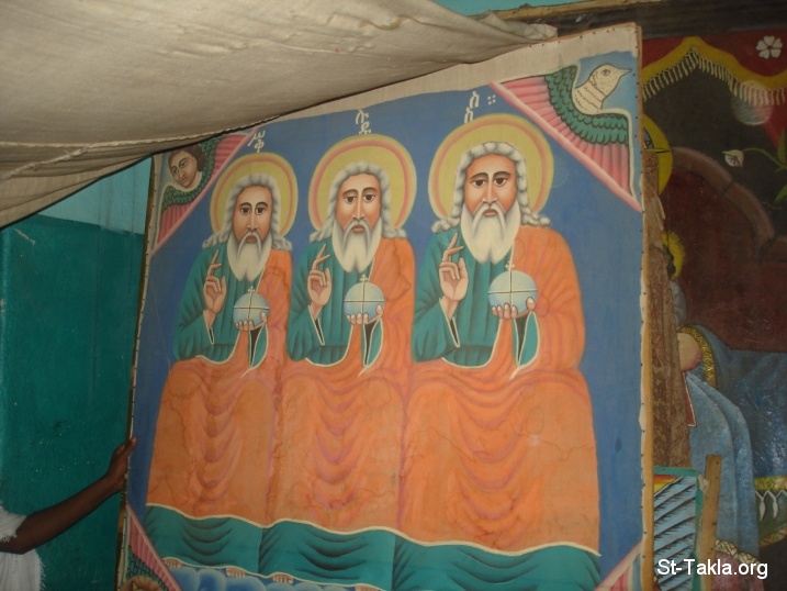 أيقونة الثالوث القدوس، وينبغي ملاحظة أننا ككنيسة قبطية أرثوذكسية لا نقوم برسم الثالوث القدوس كما هو ظاهر في هذه الصورة، فهي صورة من إحدى كنائس الحبشة، وليست كنيسة قبطية أرثوذكسية.. فالله الآب لم يَرهُ أحد قط كقول الكتاب: "اَللهُ لَمْ يَرَهُ أَحَدٌ قَطُّ. اَلابْنُ الْوَحِيدُ الَّذِي هُوَ فِي حِضْنِ الآبِ هُوَ خَبَّرَ." (إنجيل يوحنا 1: 18)